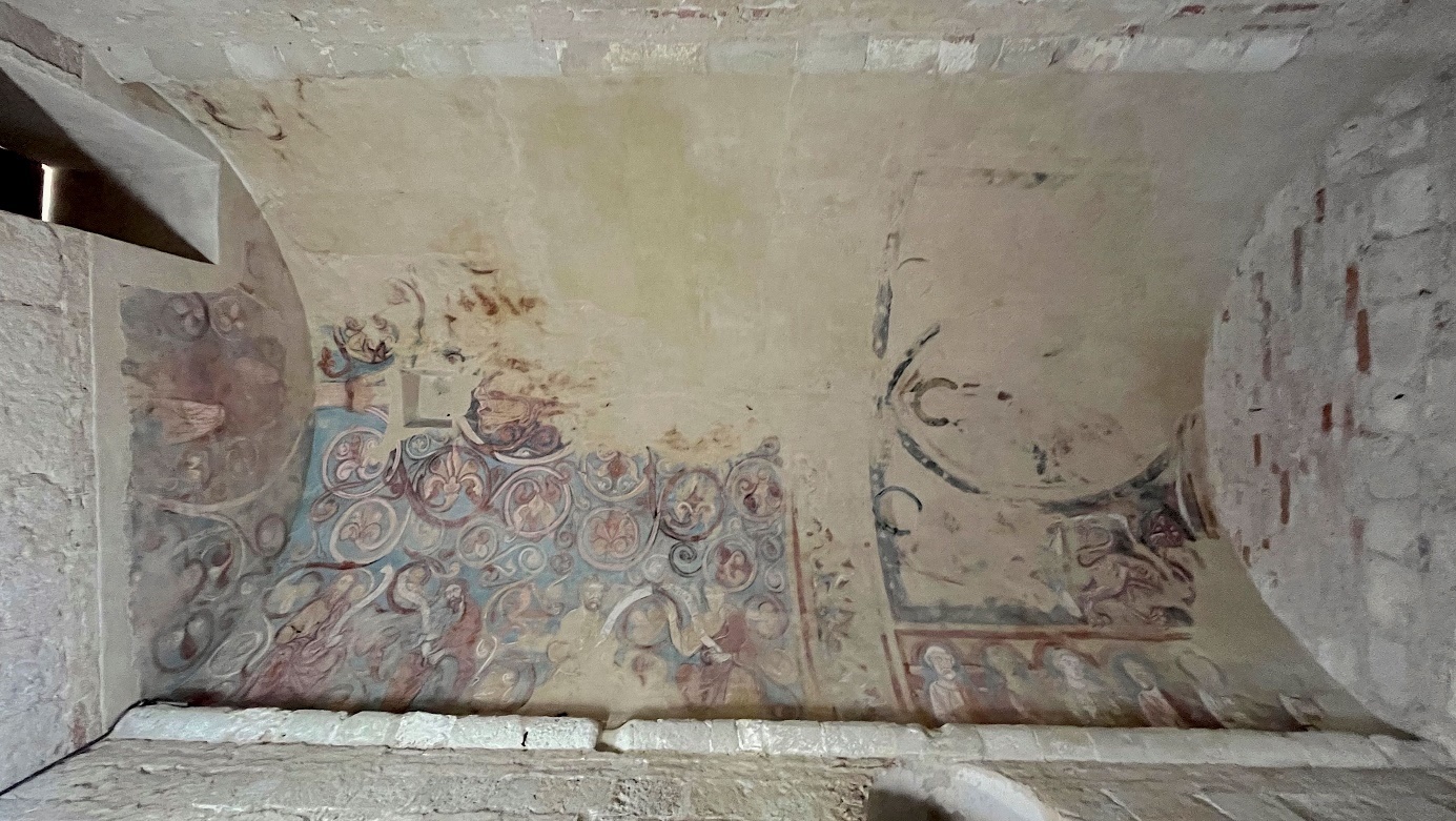La voûte de la chapelle inférieure du logis abbatial porte enfin le témoignage de peintures murales datées de la fin du XIIe siècle. Bien que fragmentaires, elles sont réhaussées de riches couleurs qui permettent d’identifier deux grands thèmes iconographiques : un imposant arbre de Jessé à gauche (3) et un Christ en gloire à droite.