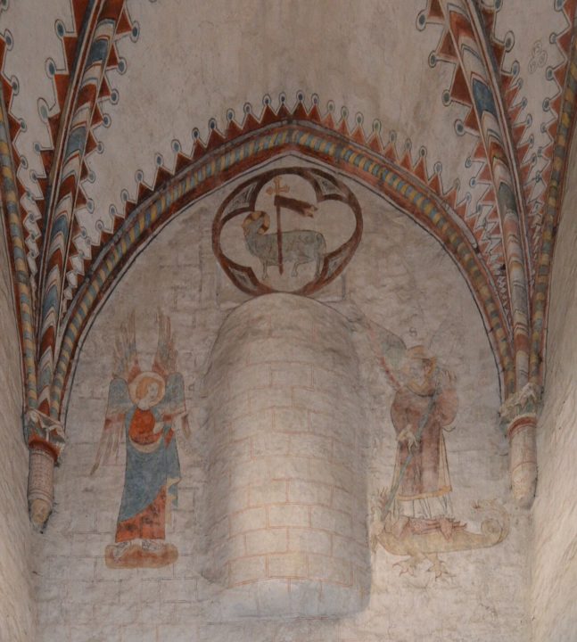 L’avant-nef conserve également les vestiges de peintures murales redécouvertes lors des restaurations de l’église entre 1899 et 1915. Réalisées au début du XIVe siècle par le même atelier, elles s’étendent sur les voûtes et les piliers du collatéral gauche et forment un vaste programme qui invite l’esprit à un cheminement symbolique.