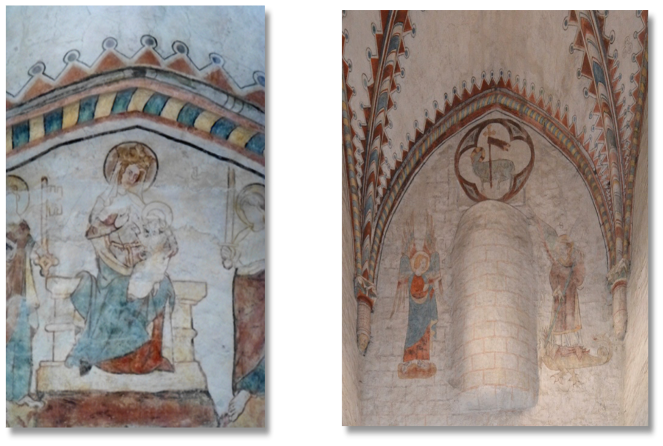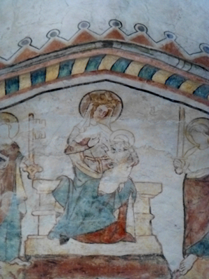 À l’est, une Vierge à l’enfant fait face à l’entrée de l’église. Couronnée et assise sur un trône, elle est vêtue d’une robe rouge et d’un manteau bleu. Sur ses genoux, l’enfant Jésus, emmailloté, tend le doigt vers elle. Les apôtres, placés de chaque côté et vêtus à l’identique, portent un livre ainsi que leurs attributs respectifs, la clé et l’épée (4).
